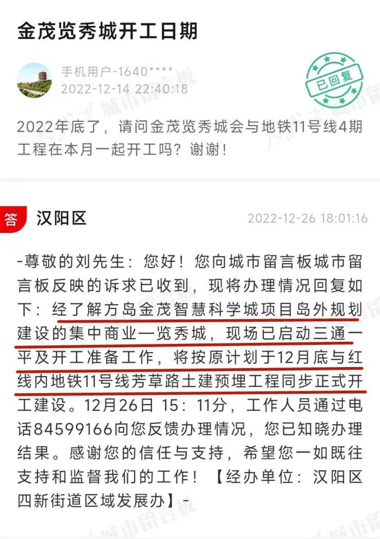 官方最新回复称:览秀城已启动三通一平及开工的准备工作,将按照原计划12月底和红线内地铁11号线芳草路站土建工程同步正式开工建设。这里说的地铁同步建设,根据之前的公示文件来看,大概意思是地铁芳草路站和览秀城商业体地下互通的意思。