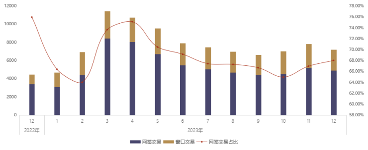 2023年12月份,经纪机构使用武汉经纪服务平台进行二手住房网签交易共4755笔,占同期二手住房交易总量的68.01%,网签交易量环比减少6.65%,同比增幅43.27%。网签交易占比环比扩大1.06个百分点。