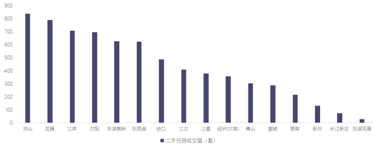 二手住房交易的活跃区域(江岸区、汉阳区、武昌区、洪山区、东湖高新区)共成交二手住房3671套,环比减少8.20%,同比增幅61.86%,占月度二手住房成交总量的52.50%,环比收窄了0.05个百分点。