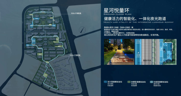 长房越秀·星悦荟还规划了特色归家园路:约2000米有氧健身跑道,助力业主健康生活方式的养成。多层次植物组团,移步换景间忘却诸多疲倦。跑道灵活串联小区各功能空间,融入标志设计、拉伸区、缓冲区、超越区、夜跑灯光设计、能量补给站等人性化配置,充满健康活力+趣味性,让运动不再单调乏味。