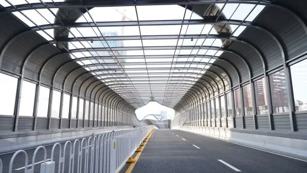 当日8时30分,记者在工程现场看到,桥梁段双向4车道全部刷黑,路面上的交通标线全部划好,各类配套设施也已安装到位,清洁人员正进行最后的清扫保洁工作,洒水车在给路面洒水。阳光下,该立交声屏障“鲲鹏展翅”的整体造型与流畅的蓝色曲线有机融合。