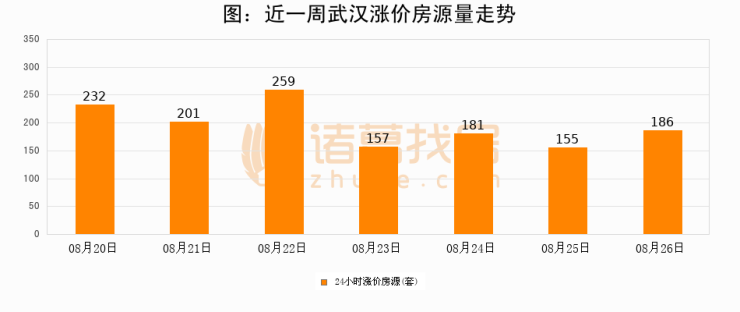 根据诸葛找房数据显示,武汉24小时涨价房源量为186套,较08月25日增加31套,环比上涨20%。与此同时,涨价房源占比小幅扩大,业主信心有所提升。
