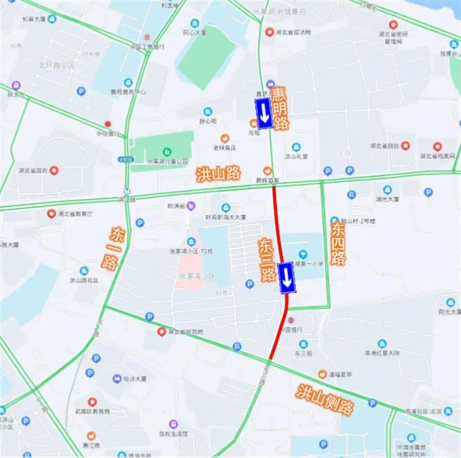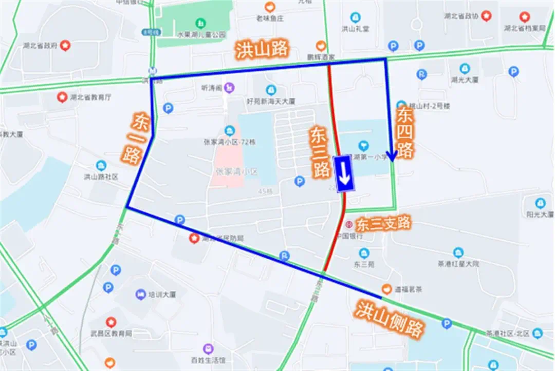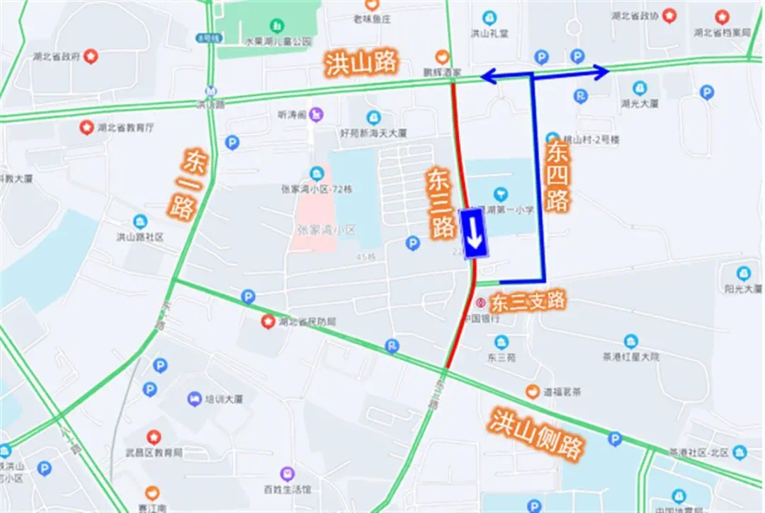 3、原经东三路往东三支路及东四路方向车辆,可绕行洪山侧路、东一路、洪山路。