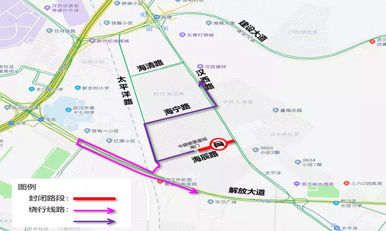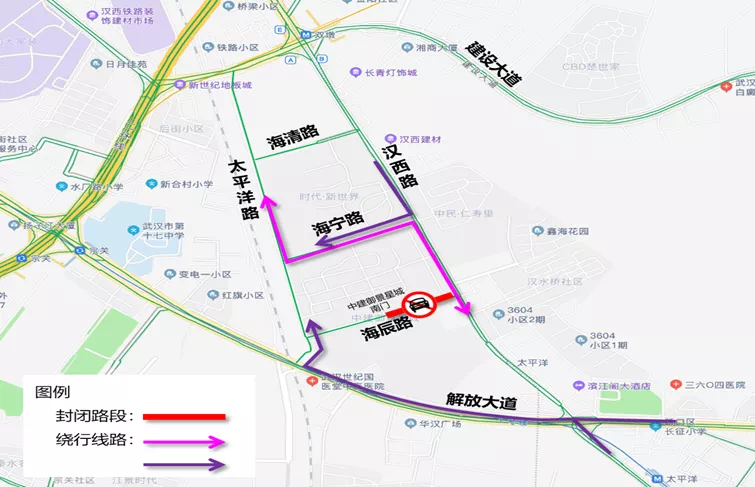 1、原通过海辰路去往汉西路、太平洋路的车辆,可绕行海宁路。