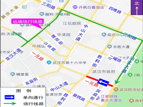 原经一元路由京汉大道往沿江大道方向的机动车可绕行京汉大道、三阳路、沿江大道等周边道路。