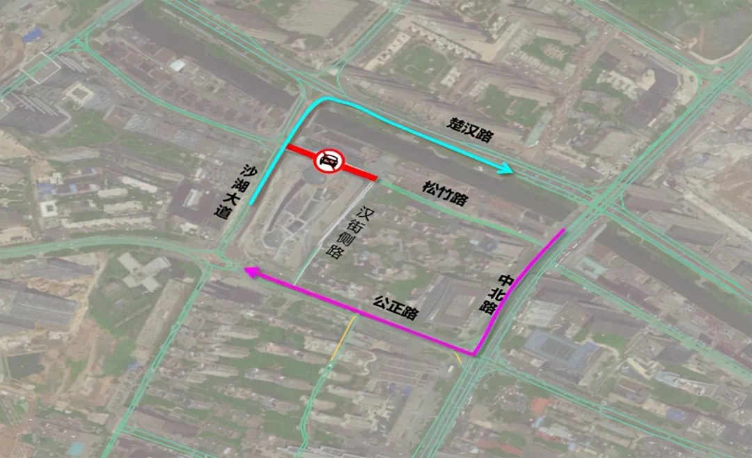 1、原松竹路由西向东的车辆建议绕行沙湖大道、楚汉路。
