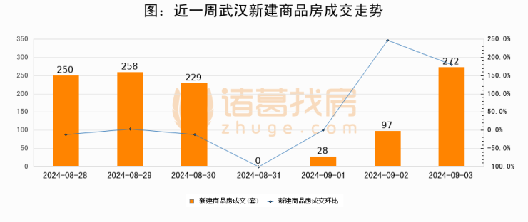 根据武汉市住房保障和房屋管理局数据显示,2024年09月03日武汉新建商品房成交272套,较昨日增加175套,环比上涨180.4%