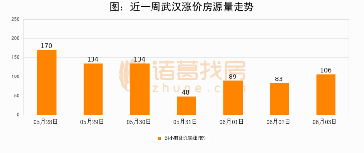 根据诸葛找房数据显示,武汉24小时涨价房源量为106套,较06月02日增加23套,环比上涨27.7%。与此同时,涨价房源占比小幅扩大,业主信心有所提升。