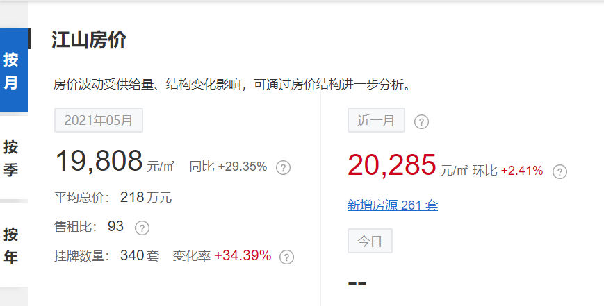 据全国房价行情网数据,江山市近一个月的二手房均价达到20285元/平方米,比去年同期上涨超过30%。这也使得江山跻身全国房价过万县城(含县级市)的前十位。