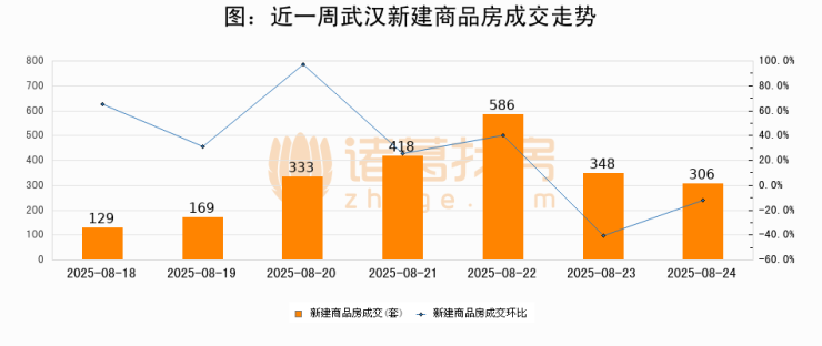 根据武汉市住房保障和房屋管理局数据显示,2025年08月24日武汉新建商品房成交306套,较昨日减少42套,环比下降12.1%。近一周武汉新建商品房日均成交327套。08月24日单日成交306套,低于近一周平均水平6.4%。