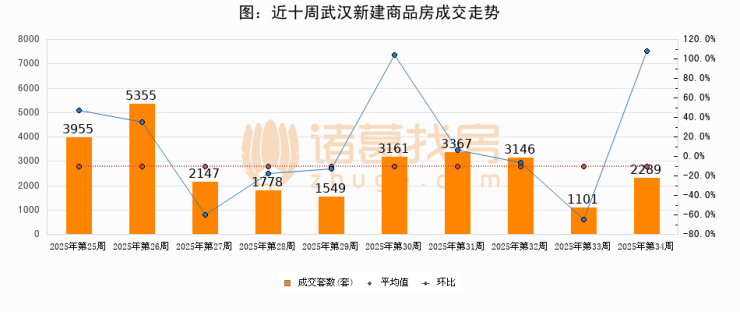 进入2025年第34周(08月18日-08月24日),武汉新建商品房成交2289套,较上周增加1188套,环比上涨107.9%