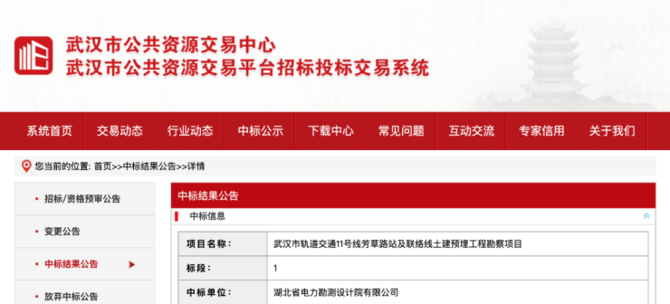5月11日消息,搜狐焦点获悉, 地铁11号线较新进展来了!近日武汉市公共资源交易中心网站公布了武汉市轨道交通11号线芳草路站及联络线土建预埋工程勘察、设计的中标结果。