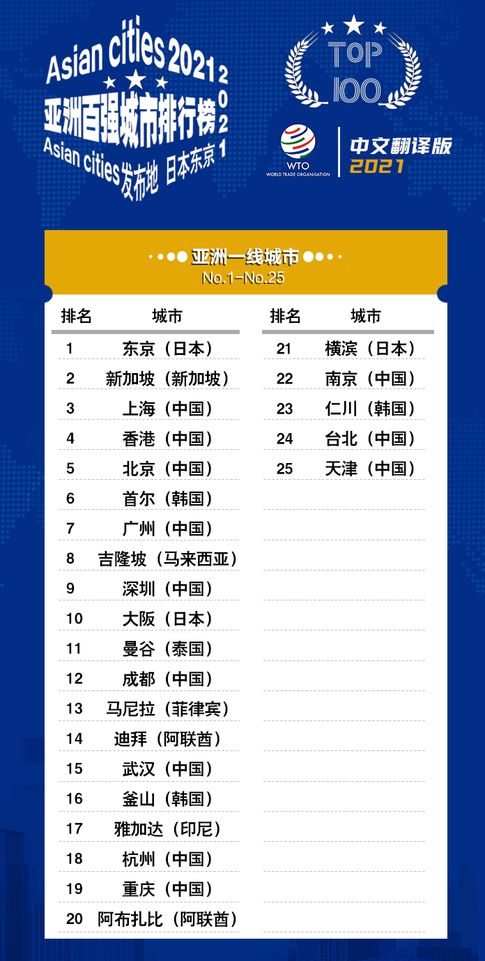 2021亚洲百强城市排行榜:武汉上榜亚洲一线城市