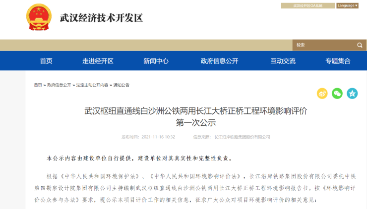 近日,长江沿岸铁路集团股份有限公司公示了两份重要文件,一个是《新建武汉枢纽直通线工程环境影响评价排名前列次公示》,另一个是《武汉枢纽直通线白沙洲公铁两用长江大桥正桥工程环境影响评价排名前列次公示》。