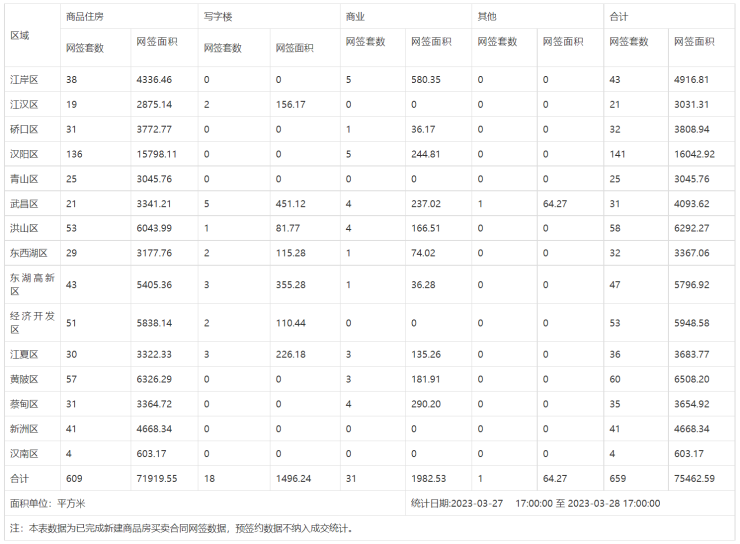 根据武汉市住房保障和房屋管理局数据显示,2023年03月28日武汉新建商品住房网签成交609套, 较昨日增加259套,环比上涨74%。