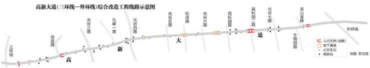 高新大道(三环线—外环线)综合改造工程全长10.7公里,将高新大道原来的双向10车道(主道6车道、辅道4车道)拓宽至双向14车道(主道8车道、辅道6车道),红线宽70米。