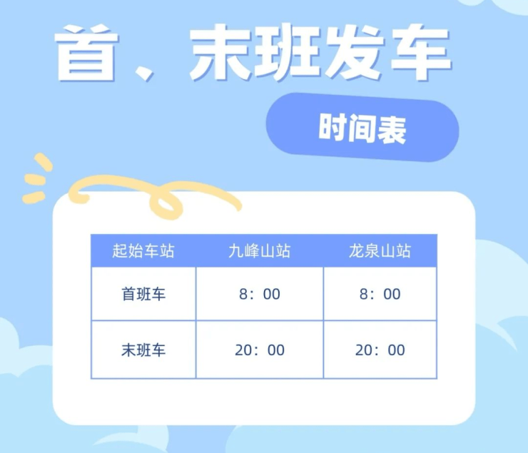 光谷空轨开通运营初期,每天运营时间为:8:00—20:00,发车间隔为10分钟,后期根据实际情况可调整运营时间和时刻表。