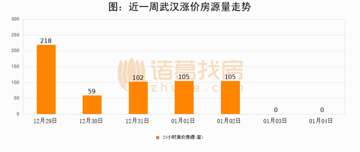 根据诸葛找房数据显示,武汉24小时涨价房源量为0套,较01月03日持平。