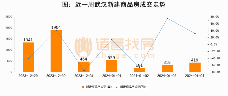 根据武汉市住房保障和房屋管理局数据显示,2024年01月04日武汉新建商品房成交419套,较昨日增加101套,环比上涨31.8%。近一周武汉新建商品房日均成交737套。01月04日单日成交419套,低于近一周平均水平43.1%。