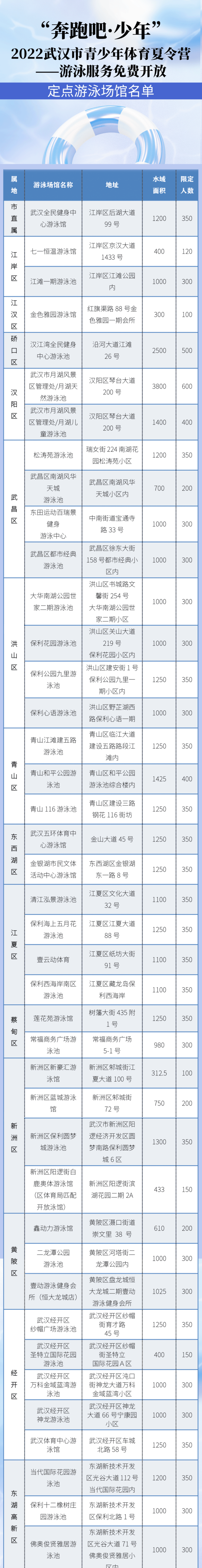 6月23日,《市体育局市教育局关于开展“奔跑吧·少年”2022年武汉市青少年体育夏令营活动的通知》正式发布,将在暑期开展免费体育技能培训和免费游泳活动 ,有意参加的青少年请做好报名准备。