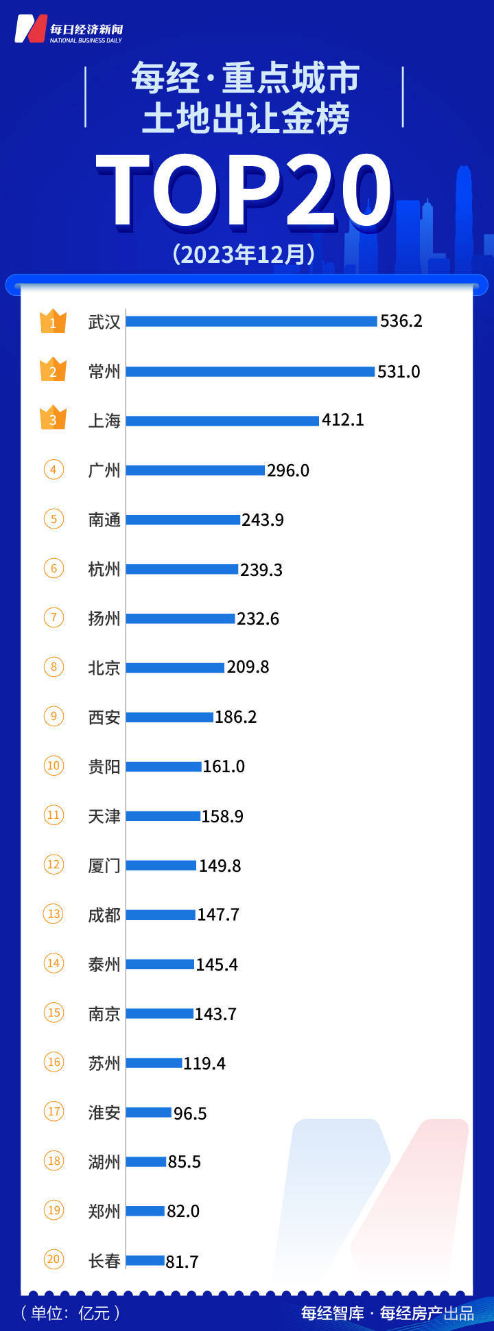 2023年12月,全国各类用地出让金TOP10城市分别是武汉、常州、上海、广州、南通、杭州、扬州、北京、西安、贵阳。其中,武汉和常州土地出让金超过500亿元,仅次于4月、10月的上海和6月的北京。