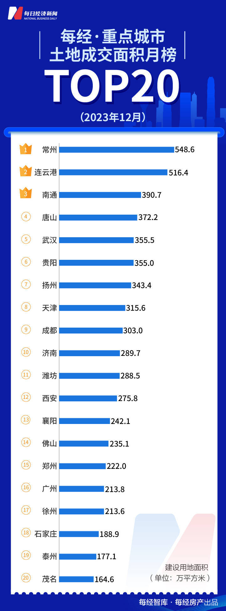 从土地成交面积榜来看,去年12月土地出让面积TOP20城市累计出让面积6012万平方米,成为全年最高的月份,常州以548.6万平方米稳居榜首。