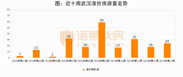 从调价房源来看,第13周武汉涨价房源24套,较上周上涨33.3%。与此同时,13周涨价房源占比提升0.62个百分点,业主信心持续恢复。