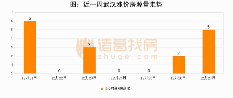 根据诸葛找房数据显示,武汉24小时涨价房源量为5套,较12月26日增加3套,环比上涨150%。与此同时,涨价房源占比小幅扩大,业主信心有所提升。