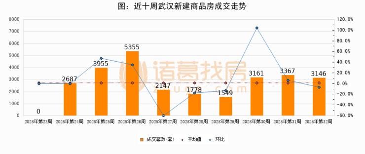 进入2025年第32周(08月04日-08月10日),武汉新建商品房成交3146套,较上周减少221套,环比下降6.6%