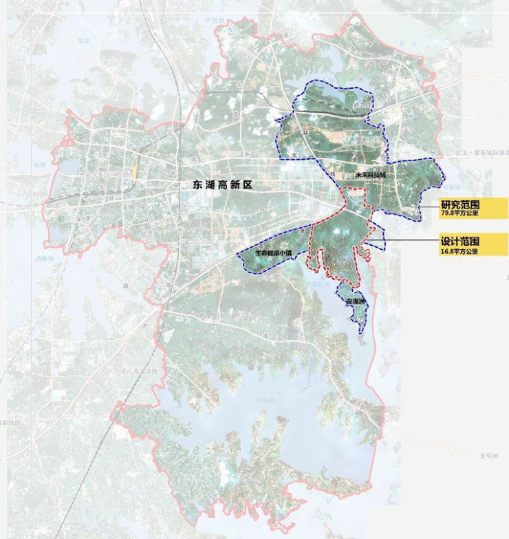 中国•光谷科学岛项目,针对产业策划、功能业态等内容,扩大至未来科技城为研究范围(含光谷生物城生命健康小镇、安湖洲湿地公园、鄂州红莲湖科技园),总用地面积约79.8平方公里,一个生态宜居和文化共享并举的区域引领之城跃然纸上。