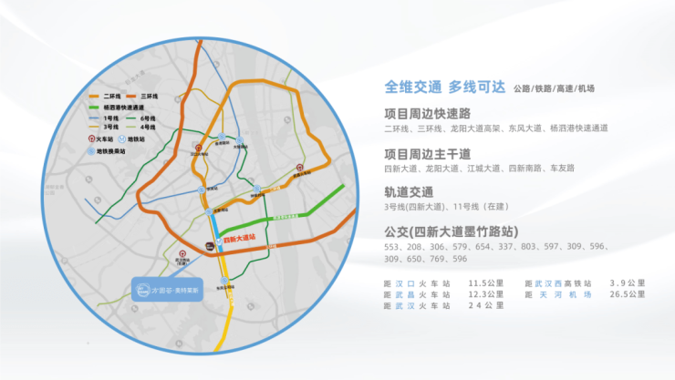 划汉阳四新片区,享有“三横六纵”九条地铁规划。其中,“三横”包括4/11/12号线,“六纵”包括3/6/10/12/16/26号线。这些地铁线路的连接,打通了四新通往全城的“经脉”。且武汉地铁11号线将在2028年6月开通运营,届时地铁3号线和11号线都可在四新大道站换乘并直达项目,还有其余多条地铁换乘,轨道交通便捷。