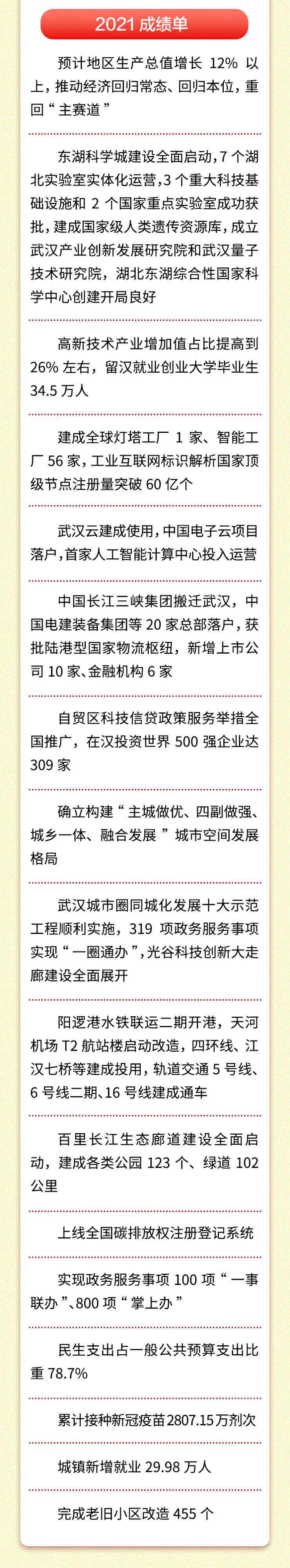 武汉市政府承诺,今年将新建社区老年人服务中心(站)80个、农村老年人互助照料中心(服务点)140个,新增家庭养老床位3000张;新改扩建幼儿园、中小学65所,新增学位4万个;筹集“高薪优岗”10万个,新建高校“学子留汉”工程工作站15家,建成就业见习和实习实训基地150个;建设筹集保障性租赁住房5.5万套(间);建成棚户区改造住房2.3万套;改造老旧小区350个;建设各类公园100个、绿道100公里、林荫路100公里、绿色驿站100个。