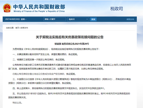五、本公告自2021年9月1日起执行。附件2中所列文件及条款规定的契税优惠政策同时废止。附件3中所列文件及条款规定的契税优惠政策失效。