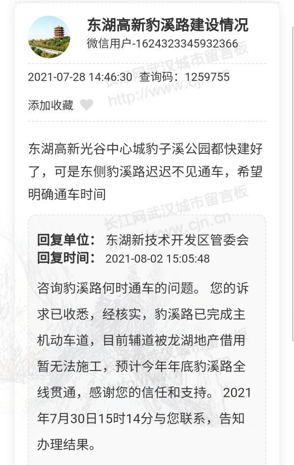 网友:光谷中心城豹子溪公园都快建好了,可是东侧豹溪路迟迟不见通车,希望明确通车时间。