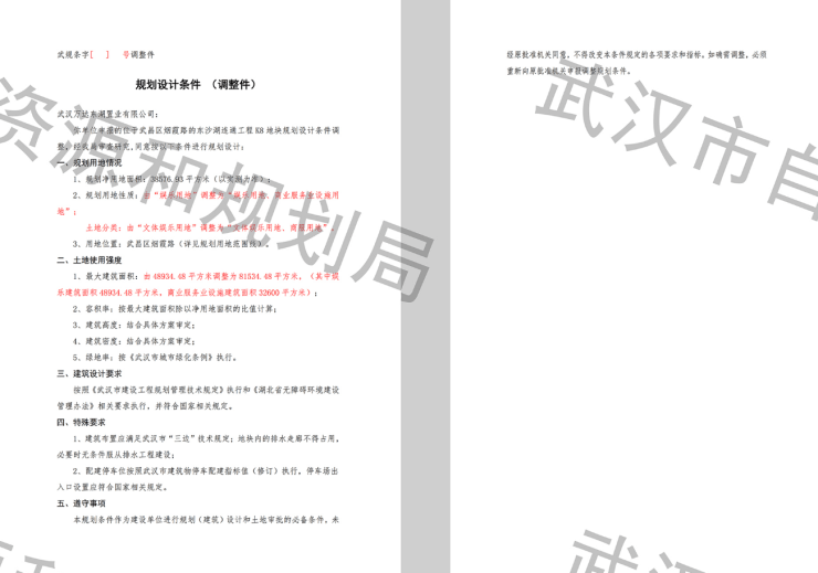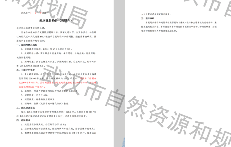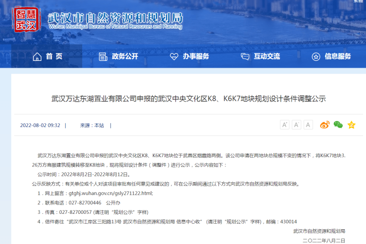8月3日消息,搜狐焦点获悉,近日,武汉市自然资源和规划局发布,武汉万达东湖置业有限公司申报的武汉中央文化区K8、K6K7地块规划设计条件调整公示。