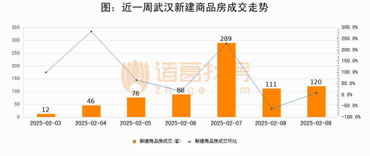 根据武汉市住房保障和房屋管理局数据显示,2025年02月09日武汉新建商品房成交120套,较昨日增加9套,环比上涨8.1%
