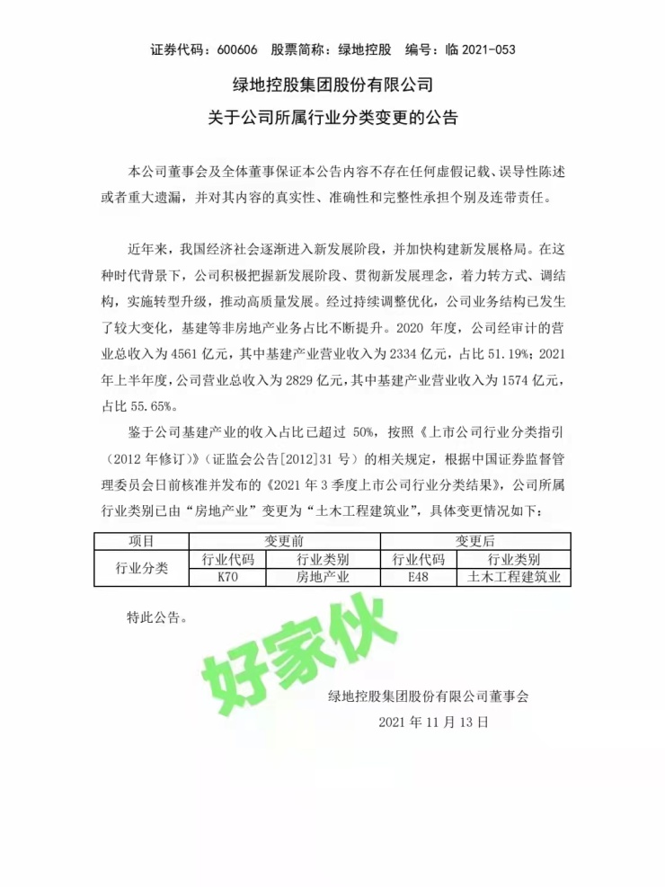 鉴于基建产业的收入占比已超过 50%,按照《上市公司行业分类指引 (2012年修订)》(证监会公告[2012]31号)的相关规定,根据中国证券监督管理委员会日前核准并发布的《2021年3季度上市公司行业分类结果》,绿地控股行业类别及代码K70 、房地产业变为E48 、土木工程建筑业。