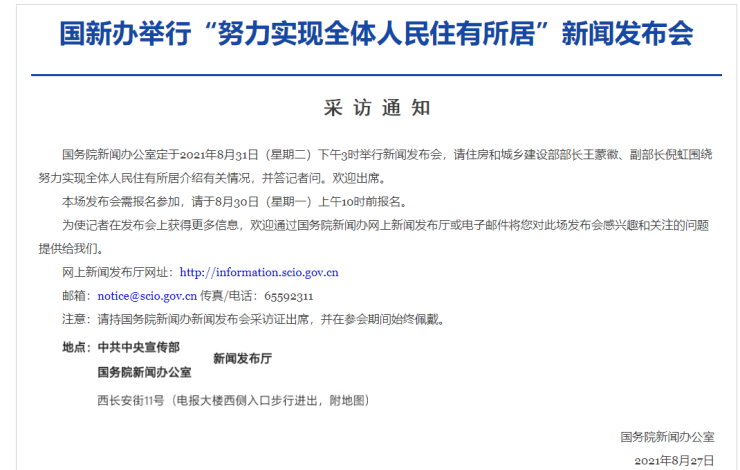 预告:国新办将举行“努力实现全体人民住有所居”新闻发布会