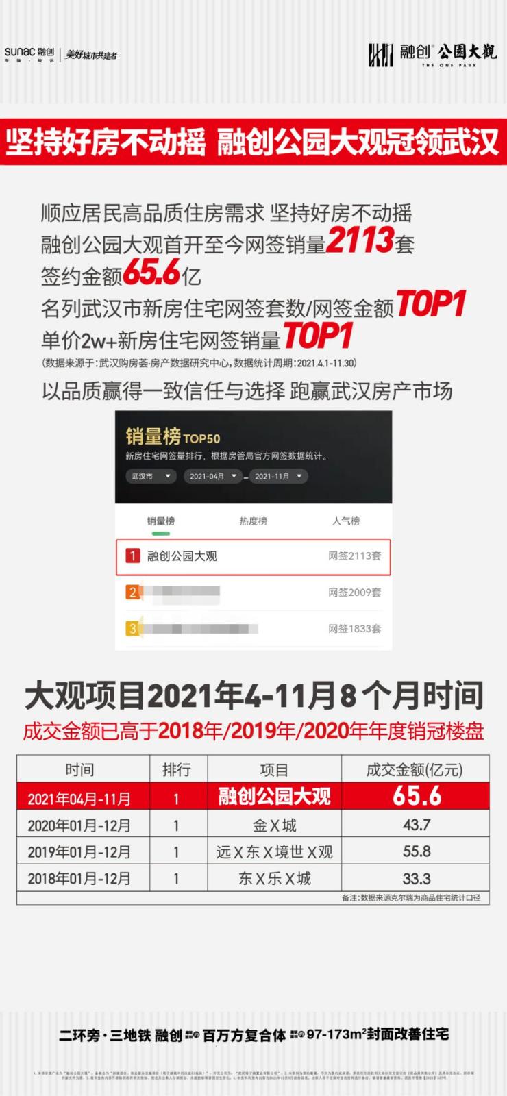 品牌的好坏更是直接反应在了市场数据上,根据房管局官方网签数据显示,融创公园大观4月首开至今,8个月的时间网签销量2113套,签约金额达到65.6亿,名列武汉市新房住宅签约金额排名前列,成交金额已高于2018-2020年年度销冠楼盘。
