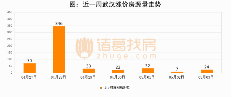 根据诸葛找房数据显示,武汉24小时涨价房源量为24套,较05月02日增加17套,环比上涨242.9%。与此同时,涨价房源占比小幅扩大,业主信心有所提升。