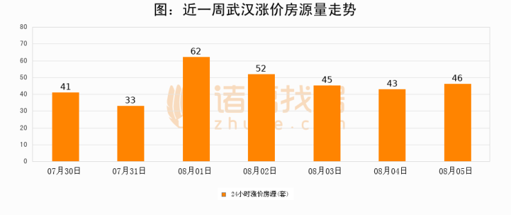 根据诸葛找房数据显示,武汉24小时涨价房源量为46套,较08月04日增加3套,环比上涨7%。与此同时,涨价房源占比小幅扩大,业主信心有所提升。