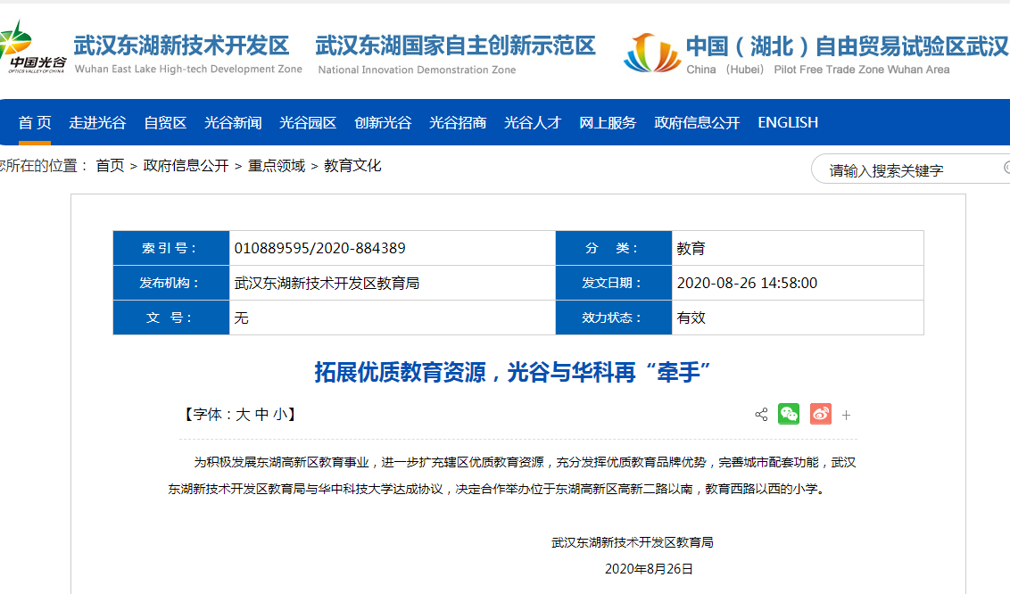 今日, 光谷与华科正式官宣了!为积极发展东湖高新区教育事业,进一步扩充辖区优质教育资源,充分发挥优质教育品牌优势,完善城市配套功能,武汉东湖新技术开发区教育局与华中科技大学达成协议,决定合作举办位于东湖高新区高新二路以南,教育西路以西的小学。 武汉东湖新技术开发区教育局 据了解,此教育地块由光谷未