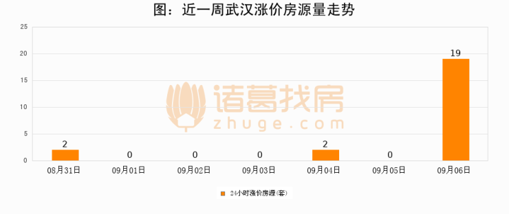 根据诸葛找房数据显示,武汉24小时涨价房源量为19套,较09月05日增加19套,环比上涨0%。与此同时,涨价房源占比小幅扩大,业主信心有所提升。