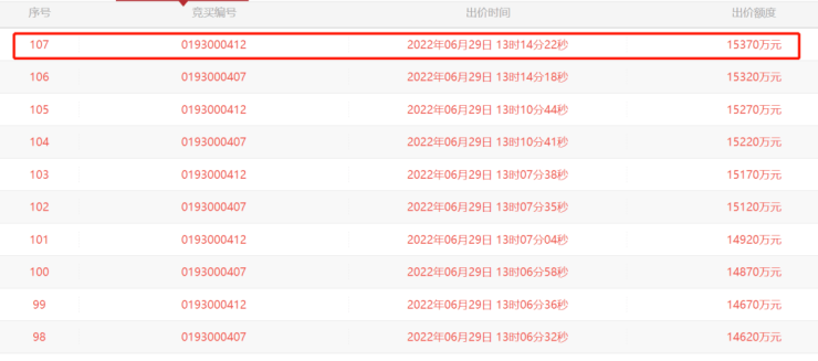 其中,竞拍最激烈的P(2022)033号地,从11点55分一直竞拍到13点14分,竞价轮数高达107轮。