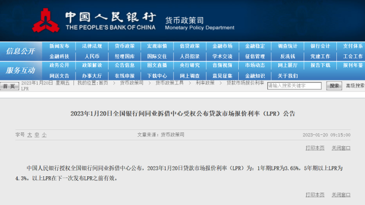搜狐焦点武汉于1月20日消息,中国人民银行授权全国银行间同业拆借中心公布,2023年1月20日LPR为:1年期LPR为3.65%,5年期以上LPR为4.3%。以上LPR在下一次发布LPR之前有效。