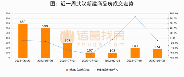 根据武汉市住房保障和房屋管理局数据显示,2023年07月05日武汉新建商品房成交174套,较昨日减少19套,环比下降9.8%