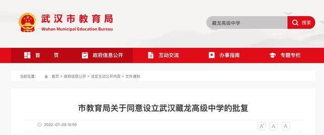 7月8日消息,搜狐焦点获悉,7月8日,武汉市教育局发布同意批复设立武汉藏龙高级中学的通知。