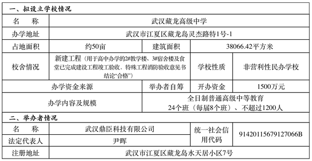 此前,市教育局对关于民办武汉藏龙高级中学正式设立进行审批前的公示,学校情况和举办者情况如下:
