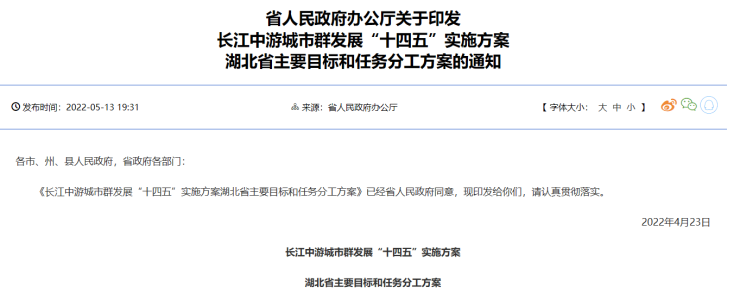 5月17日消息,搜狐焦点获悉,湖北省发布《长江中游城市群发展“十四五”实施方案湖北省主要目标和任务分工方案》,提出推动湖北在长江中游城市群高质量发展中发挥更大作用,到2025年湖北涉及地区经济总量占长江中游城市群比重继续保持首位。