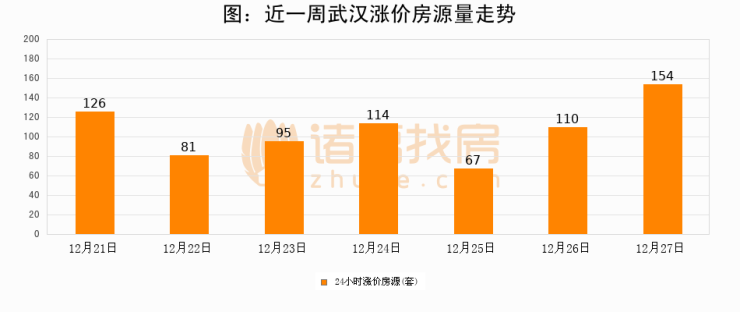 根据诸葛找房数据显示,武汉24小时涨价房源量为154套,较12月26日增加44套,环比上涨40%。与此同时,涨价房源占比小幅扩大,业主信心有所提升。
